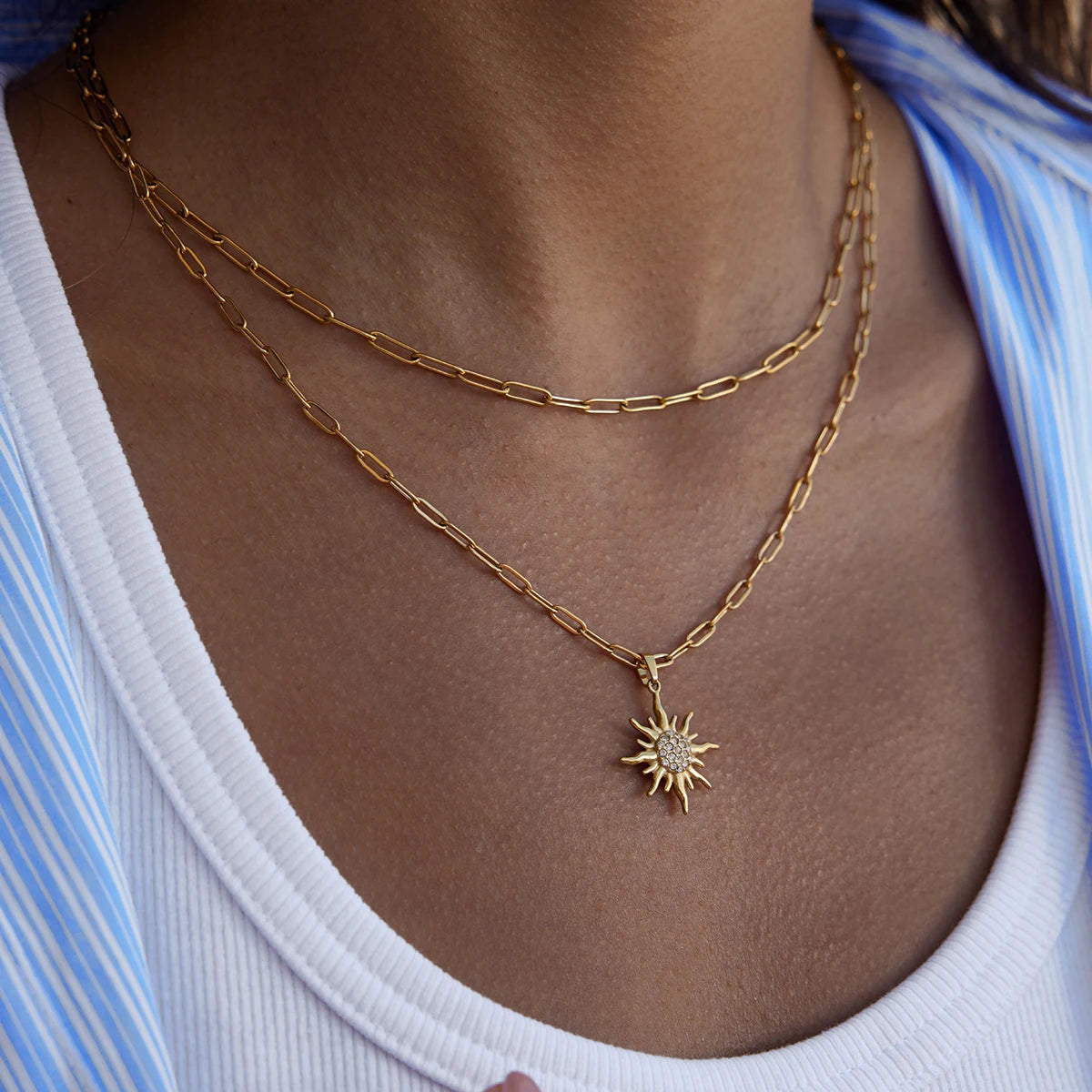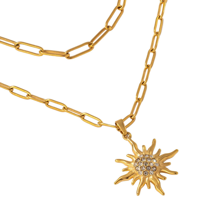 Radiate confidence with this striking double-layer necklace that commands attention. Featuring a bold white rhinestone sun pendant in lustrous 18k gold-plated stainless steel, it's the ultimate statement piece for summer.